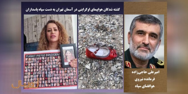 نمونهای از واکنش دادخواهان به هلاکت مقامات جمهوری اسلامی در حملات هوایی اسرائیل. گفتنی است امیرعلی حاجیزاده که کشته شدن او توسط حکومت تایید شده، مسئولیت رسمی شلیک به هواپیمای اوکراینی را به صورت علنی پذیرفته بود.