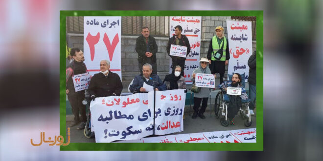 همزمان با روز جهانی معلولان، جمعی از افراد دارای معلولیت روز چهارشنبه ۱۲ آذر مقابل مجلس تجمع کردند و خواستار تأمین معیشت شدند. آنها با پلاکاردی با مضمون «معیشت شایسته، حق مسلم ماست» اعلام کردند که دولت از اجرای ماده ۲۷ قانون حمایت از معلولان طفره میرود؛ قانونی که دولت را موظف به پرداخت کمکهزینهای حداقل معادل دستمزد سالانه به افراد دارای معلولیت شدیدِ فاقد شغل میکند. با این حال، جمهوری اسلامی حتی به قانون خود نیز عمل نمیکند و بنا بر آمار، ۹۵ درصد معلولان زیر خط فقر مطلق زندگی میکنند و مستمری یکمیلیونو۴۰۰ هزار تومانیشان حتی هزینه نان ماهانه را هم پوشش نمیدهد.